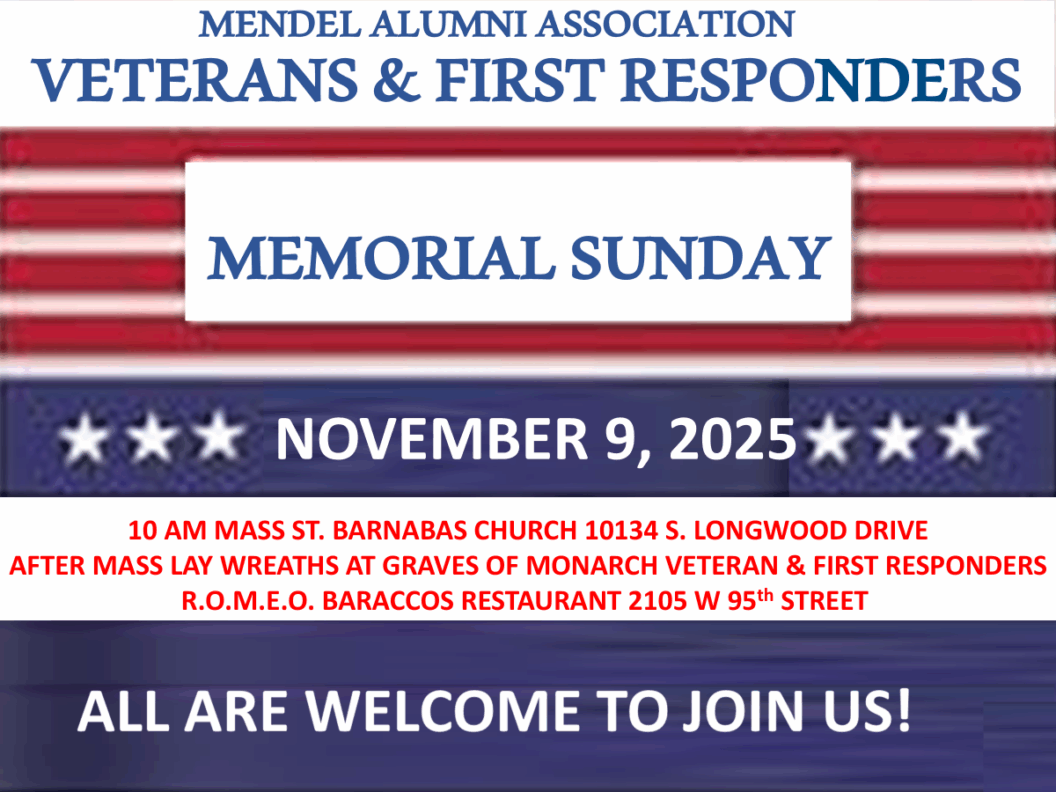 The Mendel Alumni Association Veterans & First Responders Committee invites all Monarchs, families, and friends to a special Memorial Sunday on November 9, 2025. Together we’ll honor the service and sacrifice of our veterans and first responders with Mass, wreath-layings at local graves, and fellowship afterward. All are welcome. Schedule 10:00 AM – Memorial MassSt. Barnabas Church — 10134 S. …